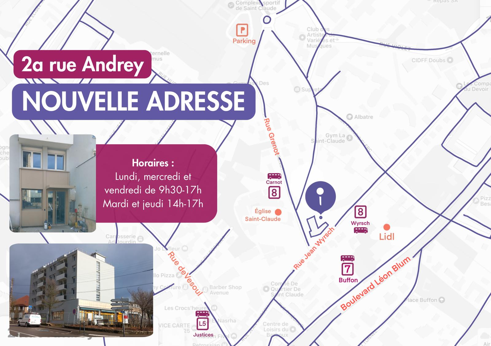 Nous vous accueillons dans nos nouveaux locaux à l’adresse suivante : 2 A rue Andrey 25000 Besançon (immeuble à l’angle avec la rue Jean Wyrsch, quartier saint Claude, à proximité de la rue de Vesoul ).